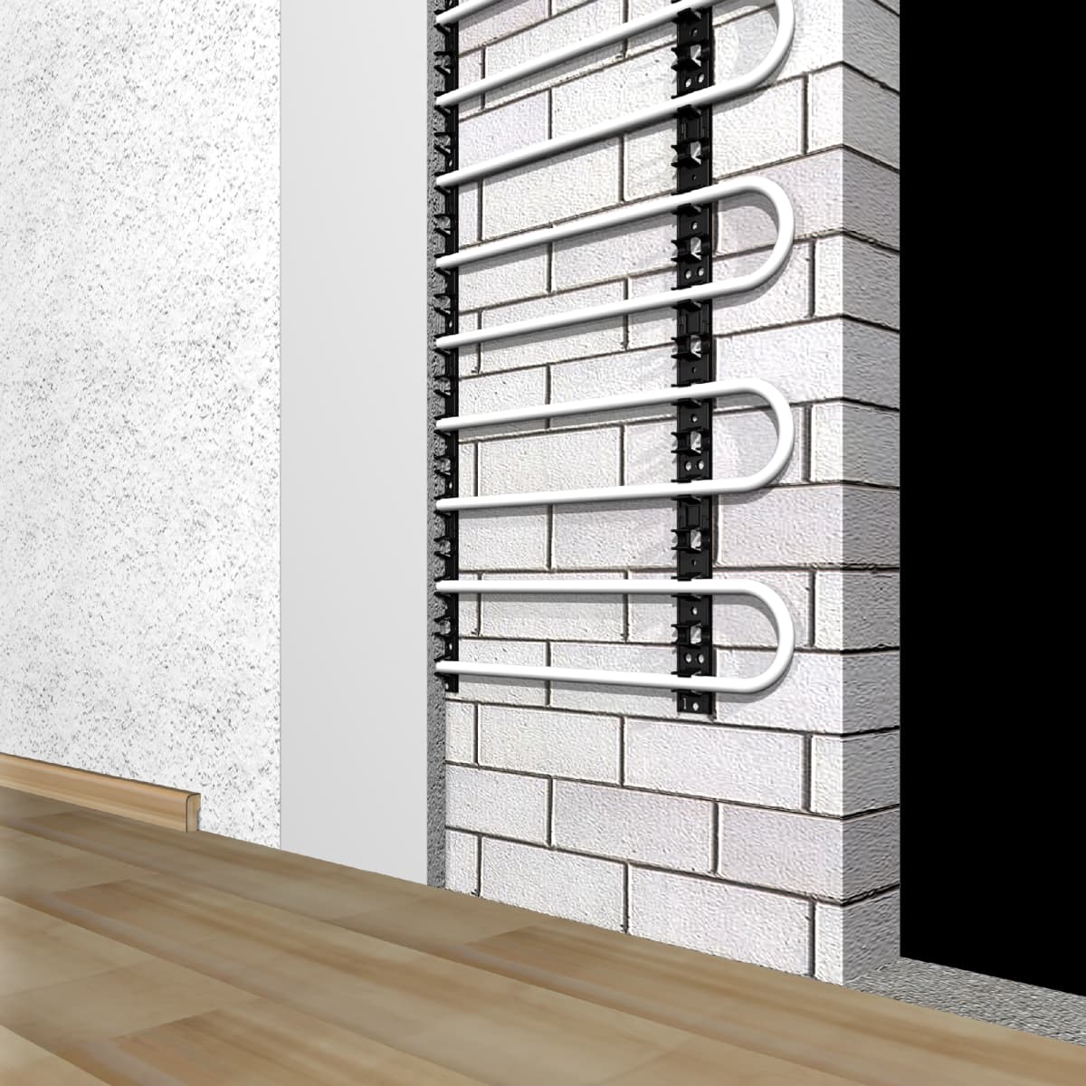 Railjet is een systeem dat speciaal is ontworpen voor gebruik op verschillende ondergronden, zoals muren. Wanneer de ondergrond bestaat uit beton, gespoten Pur of isolatieplaten, biedt Railjet System altijd een zeer solide oplossing. Omdat de montagelat pijpbeugels bevat met een tussenruimte van 5 cm, zijn de meest voor de hand liggende legafstanden perfect mogelijk