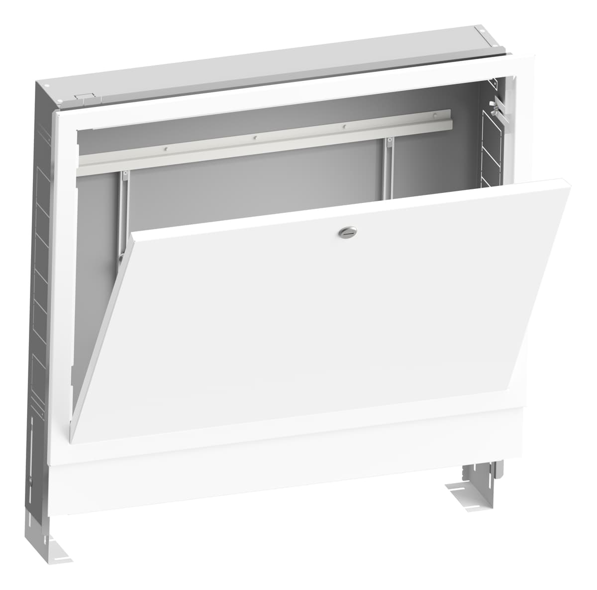 Inbouwkast voor verdelers biedt de ultieme oplossing voor het discreet inbouwen van verdelersystemen in muren. De verzinkt metalen structuur is duurzaam en gaat lang mee, met een wit RAL 9010 kunststof frame en deur voor een strakke uitstraling. Hoogte verstelbare poten en een verstelbare diepte zorgen voor eenvoudige installatie in verschillende muurdiktes, specifiek 80 mm en 120 mm bakstenen. De kast heeft een sleufschroevendraaier slot, met de optie om te upgraden naar een sleutelslot voor extra veiligheid. Dit product voldoet aan functionele eisen en behoudt een esthetische afwerking