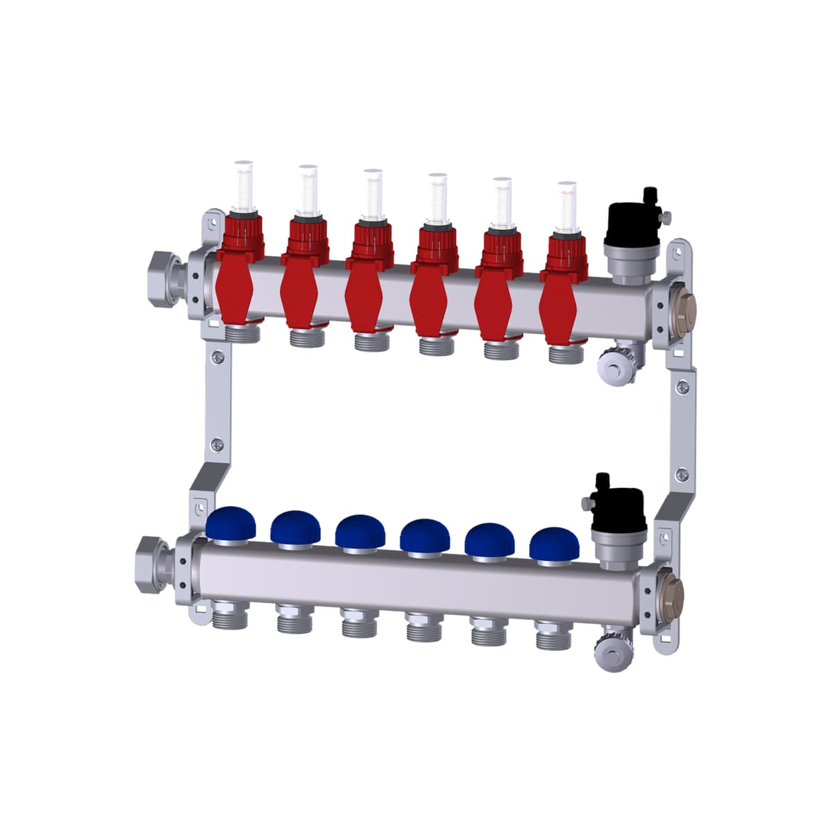 Radson Premium verdeler dient als het centrale punt voor de meeste vloerverwarmingssystemen en verdeelt gemengd water dat wordt geleverd door het verdeler controlecentrum. Het werkt op een lagere stromingstemperatuur en bevat een debietmeter, automatische ontluchter, manometer, afsluiters en fittingen voor eenvoudige installatie en onderhoud